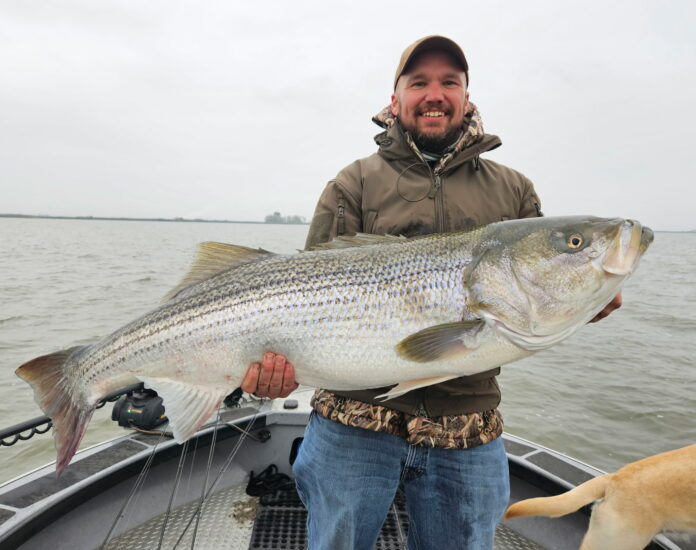Angler on guide trip boats 42-pound Delta striper